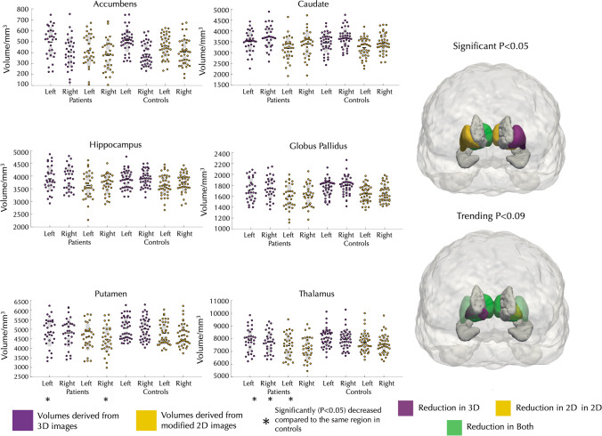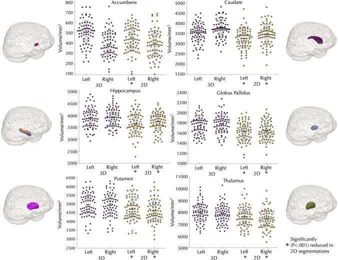 Results: All average Dice coefficients showed excellent agreement between 2 and 3D images across subcortical structures (0.86-0.96). Most 2D volumes were consistently slightly lower compared to 3D volumes. 2D images with increased slice thickness showed lower agreement with 3D images with lower Dice coefficients (0.55-0.83). Significant volume reduction of the left and right thalamus and putamen was observed in patients relative to controls across 2D and 3D images.