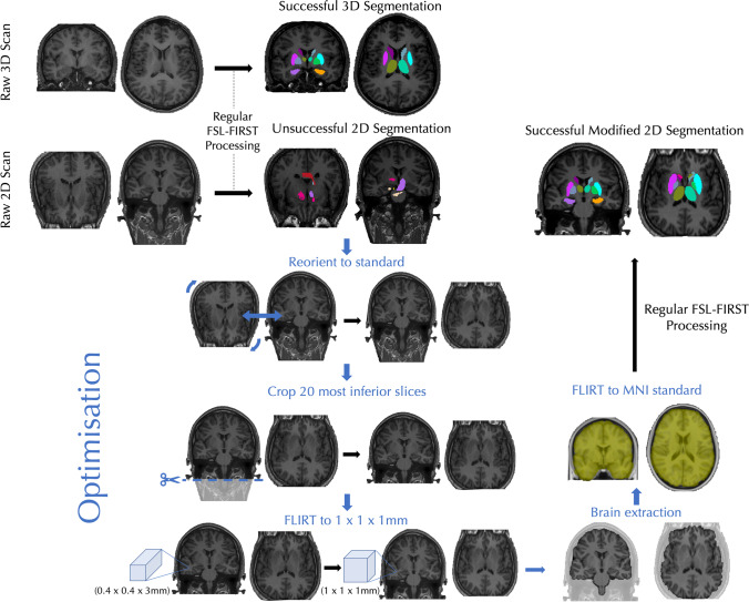Purpose: Most techniques used for automatic segmentation of subcortical brain regions are developed for three-dimensional (3D) MR images. MRIs obtained in non-specialist hospitals may be non-isotropic and two-dimensional (2D). Automatic segmentation of 2D images may be challenging and represents a lost opportunity to perform quantitative image analysis. We determine the performance of a modified subcortical segmentation technique applied to 2D images in patients with idiopathic generalised epilepsy (IGE).