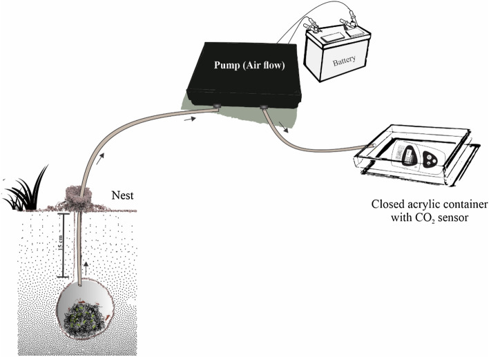 Claustral foundation of nests by Atta sexdens Forel (Hymenoptera: Formicidae) involves great effort by its queens, solely responsible for the cultivation of the fungus and care for her offspring at this stage. The minimum workers, after 4 months, open access to the external environment to foraging plants to cultivate the symbiotic fungus, which decomposes the plant fragments and produces gongilidea nodules as food for the individuals in the colony. Colony gas exchange and decomposition of organic matter in underground ant nests generate carbon dioxide (CO2) emitted into the atmosphere. We described the carbon dioxide concentration in colonies in the field. The objective was to evaluate the carbon dioxide concentration in initial A. sexdens colonies, in the field, and their development. The CO2 level was also measured in 4-month-old colonies in the field, using an open respirometric system fitted with an atmospheric air inlet. The CO2 level of the respirometric container was read by introducing a tube into the nest inlet hole and the air sucked by a peristaltic pump into the CO2 meter box. The CO2 concentration in the initial colony was also measured after 4 months of age, when the offspring production (number of eggs, larvae, pupae and adult workers) stabilized. Ten perforations (15 cm deep) was carried out in the adjacent soil, without a nest of ants nearby, to determine the concentration of CO2. The composition of the nests in the field was evaluated after excavating them using a gardening shovel and they were stored in 250 ml pots with 1 cm of moistened plaster at the bottom. The CO2 concentration was higher in field nest than in adjacent soil. The concentration of carbon dioxide in A. sexdens nests in the field is higher than in those in the soil, due to the production of CO2 by the fungus garden and colony.