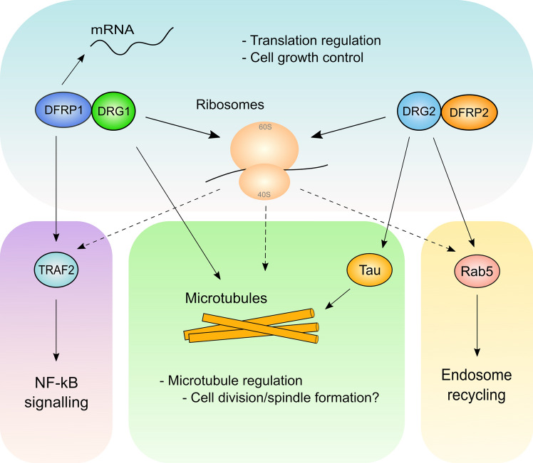GTPases are a large superfamily of evolutionarily conserved proteins involved in a variety of fundamental cellular processes. The developmentally regulated GTP-binding protein (DRG) subfamily of GTPases consists of two highly conserved paralogs, DRG1 and DRG2, both of which have been implicated in the regulation of cell proliferation, translation and microtubules. Furthermore, DRG1 and 2 proteins both have a conserved binding partner, DRG family regulatory protein 1 and 2 (DFRP1 and DFRP2), respectively, that prevents them from being degraded. Similar to DRGs, the DFRP proteins have also been studied in the context of cell growth control and translation. Despite these proteins having been implicated in several fundamental cellular processes they remain relatively poorly characterized, however. In this review, we provide an overview of the structural biology and biochemistry of DRG GTPases and discuss current understanding of DRGs and DFRPs in normal physiology, as well as their emerging roles in diseases such as cancer.