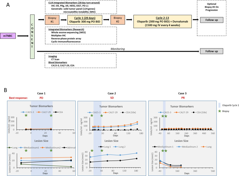 In a pilot study, we evaluated the feasibility of real-time deep analysis of serial tumor samples from triple negative breast cancer patients to identify mechanisms of resistance and treatment opportunities as they emerge under therapeutic stress engendered by poly-ADP-ribose polymerase (PARP) inhibitors (PARPi). In a BRCA-mutant basal breast cancer exceptional long-term survivor, a striking tumor destruction was accompanied by a marked infiltration of immune cells containing CD8 effector cells, consistent with pre-clinical evidence for association between STING mediated immune activation and benefit from PARPi and immunotherapy. Tumor cells in the exceptional responder underwent extensive protein network rewiring in response to PARP inhibition. In contrast, there were minimal changes in the ecosystem of a luminal androgen receptor rapid progressor, likely due to indifference to the effects of PARP inhibition. Together, identification of PARPi-induced emergent changes could be used to select patient specific combination therapies, based on tumor and immune state changes.