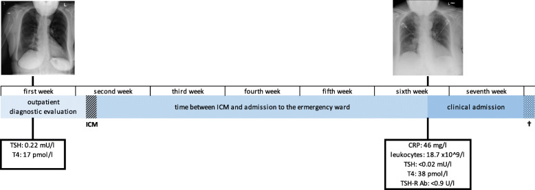Case presentation: we report the case of an 82-year-old woman who developed ICM induced hyperthyroidism after undergoing a chest computed tomography (CT). One month after ICM administration she presented with pneumonia at the emergency department. Hyperthyroidism was found with concomitant tachycardia, which was hard to control. As a result of hyperthyroidism and coincidental pneumonia the patient developed heart failure and died of myocardial ischemia.