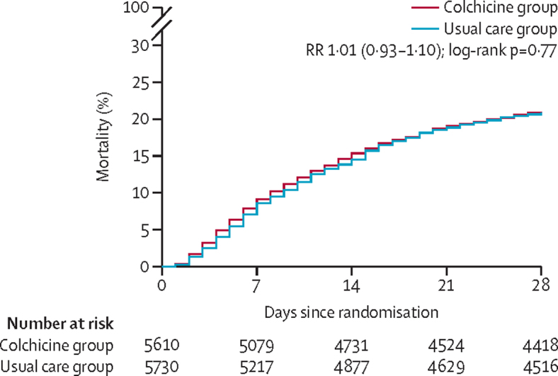 Findings: Between Nov 27, 2020, and March 4, 2021, 11 340 (58%) of 19 423 patients enrolled into the RECOVERY trial were eligible to receive colchicine; 5610 (49%) patients were randomly assigned to the colchicine group and 5730 (51%) to the usual care group. Overall, 1173 (21%) patients in the colchicine group and 1190 (21%) patients in the usual care group died within 28 days (rate ratio 1·01 [95% CI 0·93 to 1·10]; p=0·77). Consistent results were seen in all prespecified subgroups of patients. Median time to discharge alive (10 days [IQR 5 to >28]) was the same in both groups, and there was no significant difference in the proportion of patients discharged from hospital alive within 28 days (3901 [70%] patients in the colchicine group and 4032 [70%] usual care group; rate ratio 0·98 [95% CI 0·94 to 1·03]; p=0·44). In those not on invasive mechanical ventilation at baseline, there was no significant difference in the proportion meeting the composite endpoint of invasive mechanical ventilation or death (1344 [25%] in the colchicine group vs 1343 [25%] patients in the usual care group; risk ratio 1·02 [95% CI 0·96 to 1·09]; p=0·47).