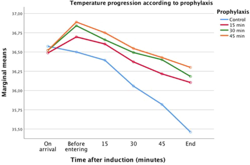 Perioperative hypothermia causes postoperative complications. Prewarming reduces body temperature decrease in long-term surgeries. We aimed to assess the effect of different time-periods of prewarming on perioperative temperature in short-term transurethral resection under general anesthesia. Randomized, double-blind, controlled trial in patients scheduled for bladder or prostatic transurethral resection under general anesthesia. Eligible patients were randomly assigned to receive no-prewarming or prewarming during 15, 30, or 45 min using a forced-air blanket in the pre-anesthesia period. Tympanic temperature was used prior to induction of anesthesia and esophageal temperature intraoperatively. Primary outcome was the difference in core temperature among groups from the induction of general anesthesia until the end of surgery. Repeated measures multivariate analysis of covariance modeled the temperature response at each observation time according to prewarming. We examined modeled contrasts between temperature variables in subjects according to prophylaxis. We enrolled 297 patients and randomly assigned 76 patients to control group, 74 patients to 15-min group, 73 patients to 30-min group, and 74 patients to the 45-min group. Temperature in the control group before induction was 36.5 ± 0.5 °C. After prewarming, core temperature was significantly higher in 15- and 30-min groups (36.8 ± 0.5 °C, p = 0.004; 36.7 ± 0.5 °C, p = 0.041, respectively). Body temperature at the end of surgery was significantly lower in the control group (35.8 ± 0.6 °C) than in the three prewarmed groups (36.3 ± 0.6 °C in 15-min, 36.3 ± 0.5 °C in 30-min, and 36.3 ± 0.6 °C in 45-min group) (p < 0.001). Prewarming prior to short-term transurethral resection under general anesthesia reduced the body temperature drop during the perioperative period. These time-periods of prewarming also reduced the rate of postoperative complications.Study Registration Registered at ClinicalTrials.gov (Identifier: NCT03630887).
