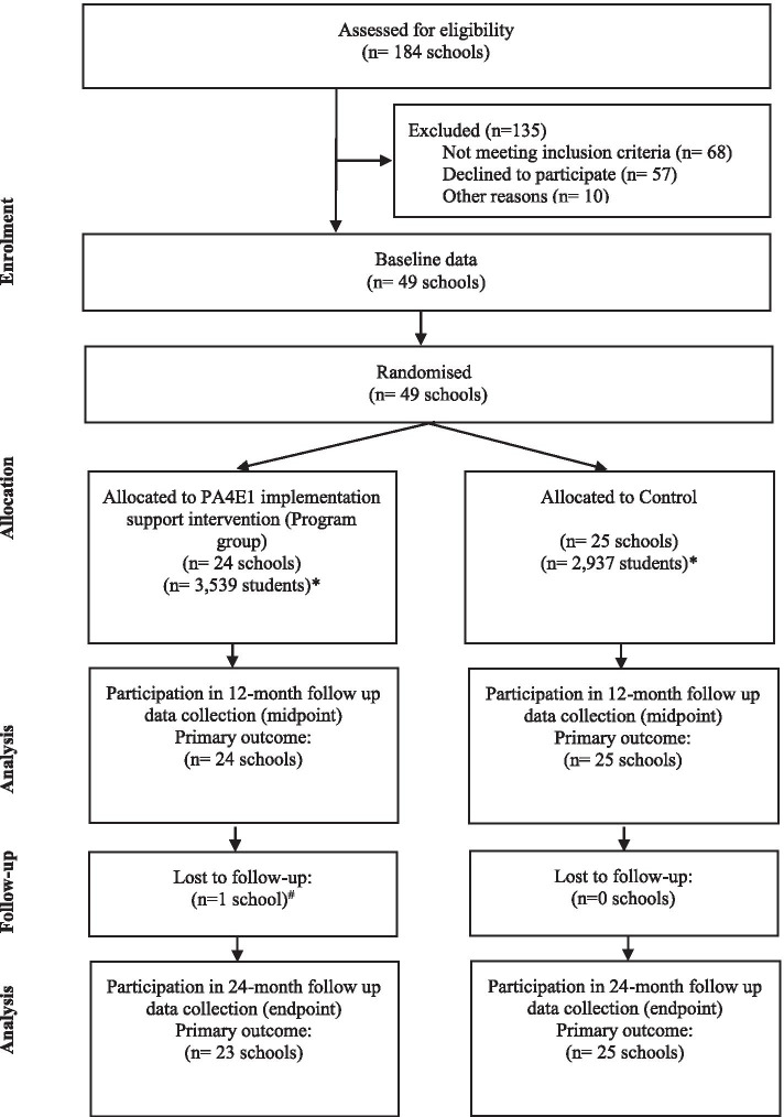 Methods: A cluster randomised controlled trial using a type III hybrid implementation-effectiveness design in 49 lower socio-economic secondary schools, randomised to a program (n = 24) or control group (n = 25). An adapted implementation intervention consisting of seven strategies was developed to support schools to implement PA4E1 over 24-months. The primary outcome was the proportion of schools implementing at least four of the 7 PA practices, assessed via computer assisted telephone interviews (CATI) with Head Physical Education Teachers. Secondary outcomes included the mean number of PA practices implemented, fidelity and reach, cost and cost-effectiveness. Logistic regression models assessed program effects.