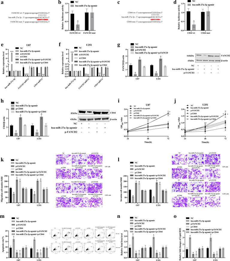 A growing body of evidence suggests that long-chain non-coding RNA (lncRNA) plays an important role in the malignant biological behavior and drug resistance of glioblastoma (GBM) cells. In this study, we analyzed the role and potential mechanism of lncRNA TMEM161B-AS1 in the malignant biological behavior of GBM cells and temozolomide (TMZ) resistance. Studies have found that FANCD2 and CD44 are significantly related to the occurrence of GBM, TMZ resistance and the survival of GBM patients. Knockdown of TMEM161B-AS1 down-regulated the expression of FANCD2 and CD44 by sponging hsa-miR-27a-3p, inhibited the proliferation, migration, invasion and promoted apoptosis, ferroptosis of U87 cells and U251 cells. Down-regulation of lncRNA TMEM161B-AS1 and/or over-expression of hsa-miR-27a-3p down-regulated the expression of FANCD2 and CD44, and inhibited the tumor growth in nude mice. These results demonstrated that the lncRNA TMEM161B-AS1-hsa-miR-27a-3p-FANCD2/CD44 signal axis regulated the malignant biological behavior of GBM and TMZ resistance. These findings were expected to provide promising therapeutic targets for the treatment of glioma.