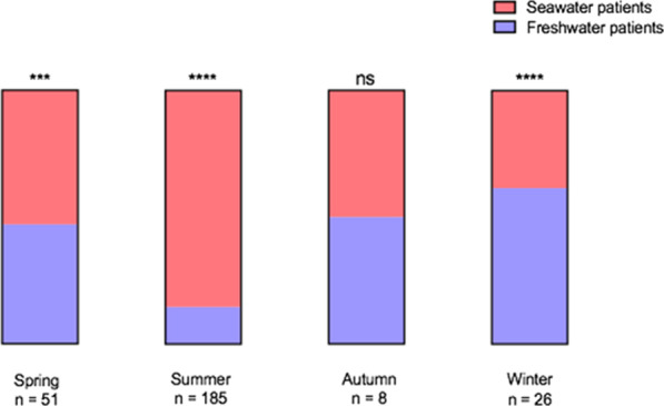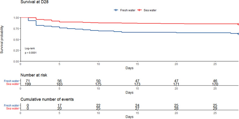 Results: Of the 270 consecutive included patients, drowning occurred in seawater in 199 patients (73.7%) and in freshwater in 71 patients (26.3%). Day-28 mortality was observed in 55 patients (20.4%). Freshwater was independently associated with 28-day mortality (Adjusted Hazard Ratio (aHR) 1.84 [95% Confidence Interval (CI) 1.03-3.29], p = 0.04). A higher proportion of freshwater patients presented psychiatric comorbidities (47.9 vs. 19.1%; p < 0.0001) and the etiology of drowning appeared more frequently to be a suicide attempt in this population (25.7 vs. 4.2%; p < 0.0001). The other factors independently associated with 28-day mortality were the occurrence of a drowning-related cardiac arrest (aHR 11.5 [95% CI 2.51-52.43], p = 0.0017), duration of cardiopulmonary resuscitation (aHR 1.05 [95% CI 1.03-1.07], p < 0.0001) and SOFA score at day 1 (aHR 1.2 [95% CI 1.11-1.3], p < 0.0001).
