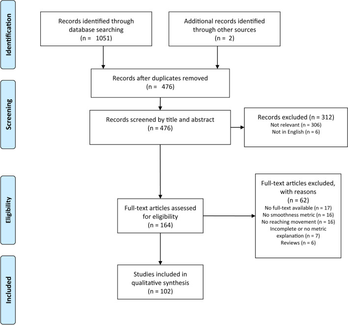 Methods: The systematic review was performed by screening electronic databases using combined keyword groups Stroke, Reaching and Smoothness. Subsequently, each metric identified was assessed with mathematical criteria regarding smoothness: (a) being dimensionless, (b) being reproducible, (c) being based on rate of change of position, and (d) not being a linear transform of other smoothness metrics. The resulting metrics were tested for their response to simulated changes in reaching using models of velocity profiles with varying reaching distances and durations, harmonic disturbances, noise, and sub-movements. Two reaching tasks were simulated; reach-to-point and reach-to-grasp. The metrics that responded as expected in all simulation analyses were considered to be valid.