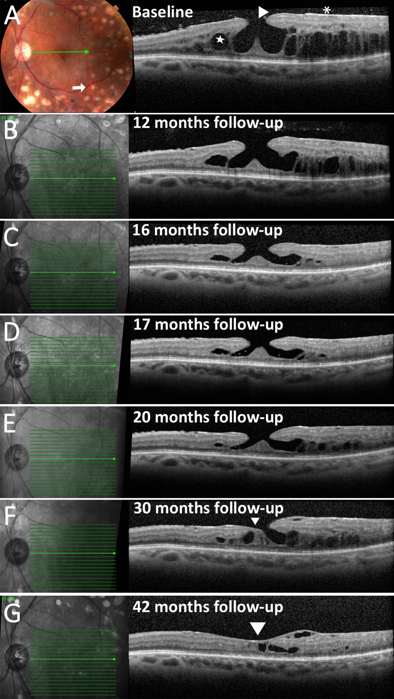 Case presentation: A 54-years-old diabetic female patient presented with progressive vision loss in the left eye. SD-OCT illustrated LHEP associated with cystic fluid in the outer nuclear layer. Sequentially tracked SD-OCT showed progressive closure of the degenerative lamellar macular hole and resolution of the CME over almost 4 years, in the absence of any surgical intervention.