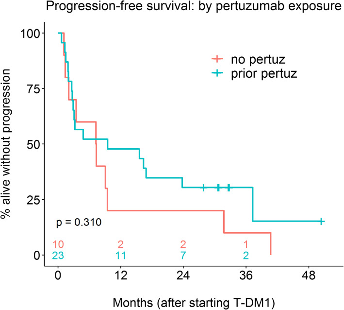 Results: Pertuzumab-pretreated patients (n = 23, with 21 evaluable for T-DM1 efficacy) had a median PFS of 9.5 months (95% CI: 2.9-NA), 1-year OS rate of 67.4% (95% CI: 50.0-90.9%) with an unreached median, ORR of 14.3% (95% CI: 3.0-36.3%), and CBR of 52.4% (95% CI: 29.8-74.3%), with none of these measures being statistically different than those estimated for the pertuzumab-naïve group (n = 10). Treatment with T-DM1 after prior pertuzumab exposure (median T-DM1 duration 2.9 months) resulted in no grade ≥ 3 adverse events.