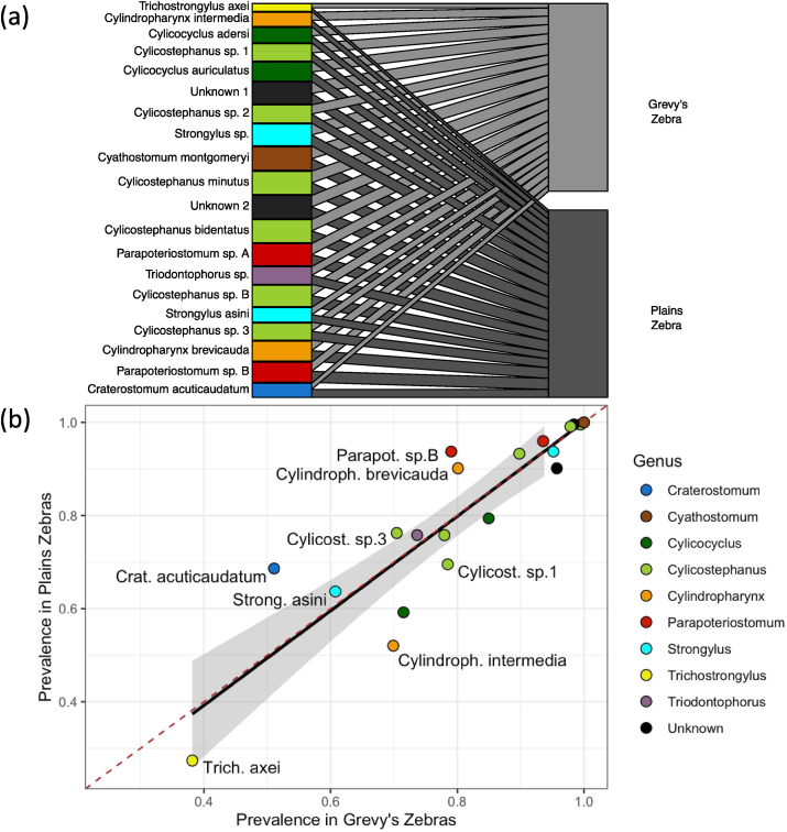 Equids are chronically infected with parasitic strongyle nematodes. There is a rich literature on horse strongyles, but they are difficult to identify morphologically and genetic studies on strongyles infecting other equid species are few, hampering studies of host specificity. We sequenced expelled worms from two sympatric zebra species in central Kenya to expand the strongyle phylogeny and used DNA metabarcoding on faecal samples to genetically characterize zebra nemabiomes for the first time. We generated sequences for several species new to public genetic reference databases, all of which are typical strongyles in wild zebras (i.e., the three species of Cylindropharynx and Cyathostomum montgomeryi), and identified their closest relatives. We also discovered an apparent fungus infecting a quarter of the expelled Crossocephalus viviparus worms, a hyperabundant nematode species in the family Atractidae, hinting at the possibility that zebra host-parasite dynamics may involve a zebra-fungus mutualism. The two zebra species had similar nemabiomes; we found a complete overlap in the list of nematode species they carry and very similar prevalence (i.e., proportion of hosts infected) for the different nematode species. Our study suggests limited host-specificity in zebra strongyles and high potential for transmission between the plains zebra and the endangered Grevy's zebra.