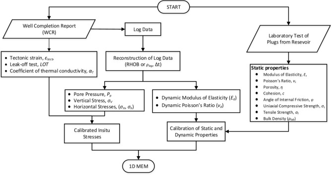 Estimating rock-mechanical, petrophysical properties and pre-production stress state is essential for effective reservoir planning, development, and optimal exploitation. This paper attempts to construct a comprehensive one-dimensional mechanical earth model (1D MEM) of the Mandapeta gas reservoir of Krishna Godavari (KG) basin, India. The methodology comprises a detailed stepwise process from processing and analysis of raw log data, calibration of log-derived dynamic properties with static ones using regression models developed from tested core samples, and final rock mechanical property estimation. Pore pressure profiles have been estimated and calibrated with the Repeat formation tester (RFT) data for every thirty-five wells. Overburden and horizontal stresses have also been evaluated and calibrated using data from the Leak-off Tests (LOT) or Extended Leak-off Tests (XLOT). A menu-driven program is developed using PYTHON code for visualization and on-time revision of 1D MEM. The resulting comprehensive 1D MEM predicts and establishes the rock-mechanical properties, pore pressure, and in-situ stress values of the basin. Besides its use in planning future wells, development of the field, and yielding insight into the various well challenges, it can also be used to develop a 3D MEM of the reservoir.