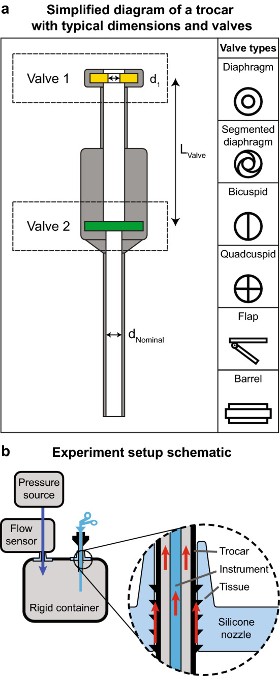 Methods: A model of the surgical environment was created, consisting of a rigid container with an interface for airtight clamping of laparoscopic equipment such as trocars and surgical instruments. The model was insufflated to 15 mm Hg using a pressure generator and a pneumotachograph measured the equipment gas leak. A protocol of several use cases was designed to simulate the motions and forces the surgeon exerts on the trocar during surgery.