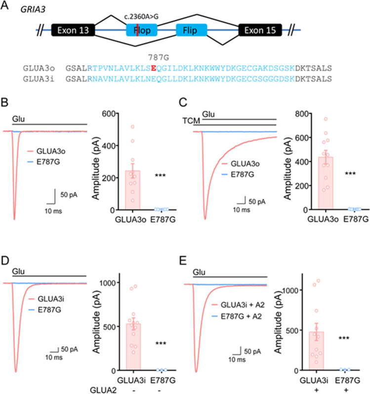 AMPA-type glutamate receptors (AMPARs) are postsynaptic ionotropic receptors which mediate fast excitatory currents. AMPARs have a heterotetrameric structure, variably composed by the four subunits GluA1-4 which are encoded by genes GRIA1-4. Increasing evidence support the role of pathogenic variants in GRIA1-4 genes as causative for syndromic intellectual disability (ID). We report an Italian pedigree where some male individuals share ID, seizures and facial dysmorphisms. The index subject was referred for severe ID, myoclonic seizures, cerebellar signs and short stature. Whole exome sequencing identified a novel variant in GRIA3, c.2360A > G, p.(Glu787Gly). The GRIA3 gene maps to chromosome Xq25 and the c.2360A > G variant was transmitted by his healthy mother. Subsequent analysis in the family showed a segregation pattern compatible with the causative role of this variant, further supported by preliminary functional insights. We provide a detailed description of the clinical evolution of the index subjects and stress the relevance of myoclonic seizures and cerebellar syndrome as cardinal features of his presentation.