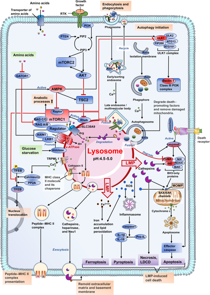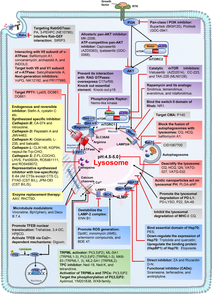 In recent years, accumulating evidence has elucidated the role of lysosomes in dynamically regulating cellular and organismal homeostasis. Lysosomal changes and dysfunction have been correlated with the development of numerous diseases. In this review, we interpreted the key biological functions of lysosomes in four areas: cellular metabolism, cell proliferation and differentiation, immunity, and cell death. More importantly, we actively sought to determine the characteristic changes and dysfunction of lysosomes in cells affected by these diseases, the causes of these changes and dysfunction, and their significance to the development and treatment of human disease. Furthermore, we outlined currently available targeting strategies: (1) targeting lysosomal acidification; (2) targeting lysosomal cathepsins; (3) targeting lysosomal membrane permeability and integrity; (4) targeting lysosomal calcium signaling; (5) targeting mTOR signaling; and (6) emerging potential targeting strategies. Moreover, we systematically summarized the corresponding drugs and their application in clinical trials. By integrating basic research with clinical findings, we discussed the current opportunities and challenges of targeting lysosomes in human disease.