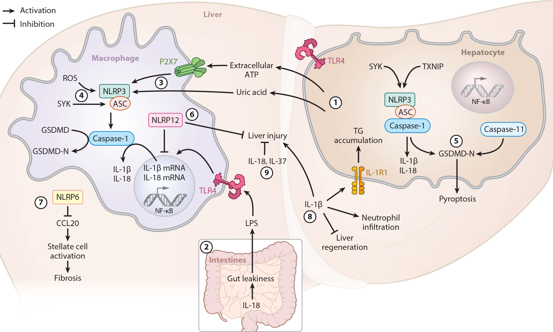 Keywords: GSDMD; IL-18; IL-1β; alcohol-associated liver diseases; canonical inflammasomes; hepatocyte; macrophage; nonalcoholic steatohepatitis; noncanonical inflammasomes; pyroptosis.