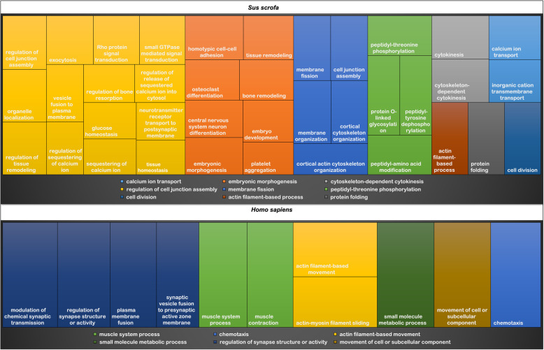 Results: In the exome sequencing, 119 variants located in 58 genes were identified differing between normal and UH-affected pigs, and in the umbilical ring transcriptome, 46 variants were identified, located in 27 genes. Comparing the two methodologies, we obtained 34 concordant variants between the exome and transcriptome analyses, which were located in 17 genes, distributed in 64 biological processes (BP). Among the BP involved with UH it is possible to highlight cell adhesion, cell junction regulation, embryonic morphogenesis, ion transport, muscle contraction, within others.