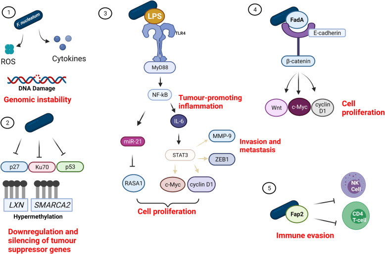There is a growing level of interest in the potential role inflammation has on the initiation and progression of malignancy. Notable examples include Helicobacter pylori-mediated inflammation in gastric cancer and more recently Fusobacterium nucleatum-mediated inflammation in colorectal cancer. Fusobacterium nucleatum is a Gram-negative anaerobic bacterium that was first isolated from the oral cavity and identified as a periodontal pathogen. Biofilms on oral squamous cell carcinomas are enriched with anaerobic periodontal pathogens, including F. nucleatum, which has prompted hypotheses that this bacterium could contribute to oral cancer development. Recent studies have demonstrated that F. nucleatum can promote cancer by several mechanisms; activation of cell proliferation, promotion of cellular invasion, induction of chronic inflammation and immune evasion. This review provides an update on the association between F. nucleatum and oral carcinogenesis, and provides insights into the possible mechanisms underlying it.