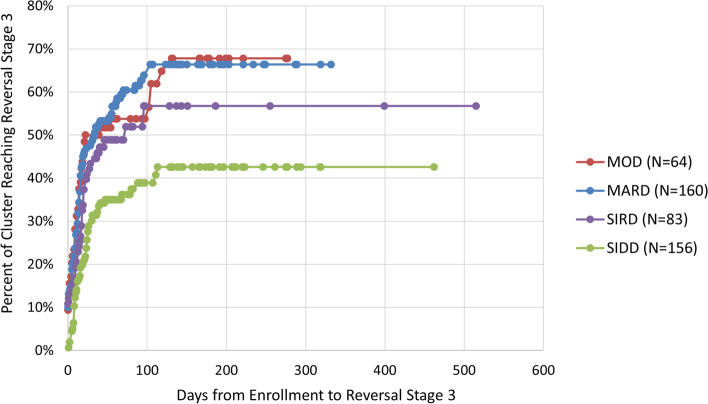 Conclusions: Type 2 diabetes patients reached differing reversal stages during 90 days of precision nutrition therapy. Use of reversal stages may benefit patients during therapy.