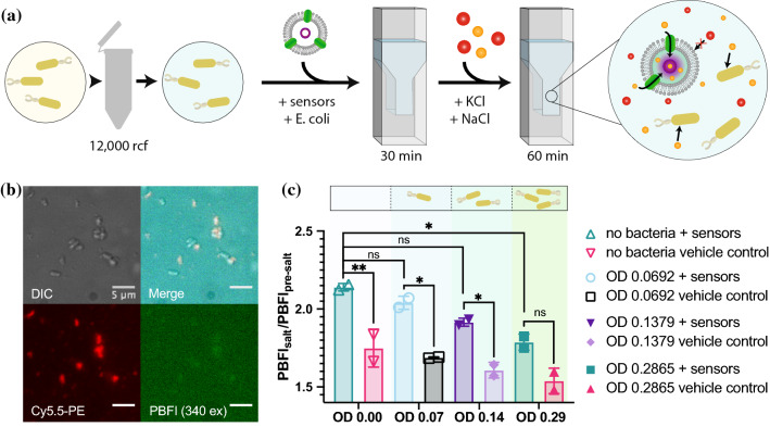 Methods: We assembled phospholipid vesicles that incorporated valinomycin, a K+ specific membrane transporter, and that encapsulated benzofuran isophthalate (PBFI), a K+ sensitive dye that nonspecifically fluoresces in the presence of other ions, like sodium (Na+). The specificity, kinetics, and reversibility of encapsulated PBFI fluorescence was determined in a plate reader and fluorimeter. The sensors were then added to E. coli bacterial cultures to evaluate K+ levels in media as a function of cell density.
