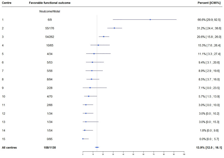 Results: Of the 1144 patients with non-inclusion criteria, 1130 had day-90 information and, among these, 158 (14%) had good functional outcomes, compared to 7.9% overall in the HYPERION trial (10.2% with and 5.7% without hypothermia). Considerable centre-to-centre variability was found in the proportion of non-included patients who received hypothermia (0% to 83.8%) and who had good day-90 functional outcomes (0% to 31.3%). The proportion of patients with a good day-90 functional outcome was significantly higher with than without hypothermia (18.5% vs. 11.9%, P = 0.003).