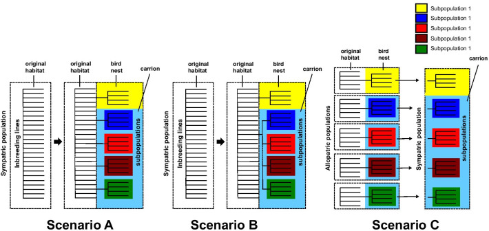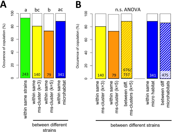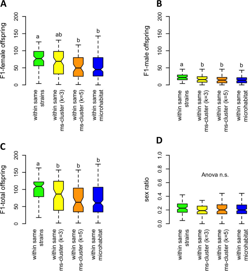 Results: We found considerable inbreeding within female strains and a population structure with either three or five subpopulation clusters defined by microsatellites. In addition, there are two ecotypes, one parasitizing fly pupae in bird nests and the other on carrion. The nest ecotype is mainly formed from one of the microsatellite clusters, the two or four remaining microsatellite clusters form the carrion ecotype. There was slight sexual isolation and a reduction in F1-female offspring between inbreeding strains from the same microsatellite clusters and the same ecotypes. Strains from different microsatellite clusters are separated by a reduction in F1-female offspring. Ecotypes are separated only by ecological barriers.