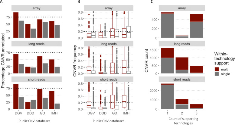 Conclusions: Our study confirms that long-read platforms enable recalling CNVs in genomic regions inaccessible to arrays or short reads. We also found that the reproducibility of a CNV by different pipelines within each technology is strongly linked to other CNV evidence measures. Importantly, the three technologies show distinct public database frequency profiles, which differ depending on what technology the database was built on.