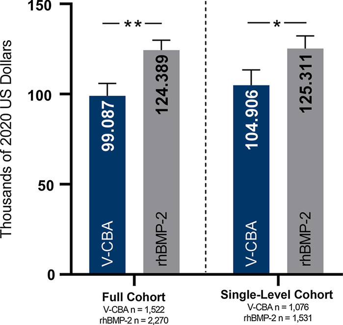 Results: The adjusted cumulative mean 24-month follow-up hospitalization charges in the full cohort were significantly lower in the V-CBA group ($99,087) versus the rhBMP-2 group ($124,389; P < 0.0001), and this pattern remained in the single-level cohort (V-CBA = $104,906 vs rhBMP-2 = $125,311; P = 0.0006). There were no differences between groups in adjusted cumulative mean LOS in either cohort. Differences in the rates of follow-up readmissions aligned with baseline comorbidities originally reported for the initial procedure. Subsequent lumbar fusion rates were significantly lower for V-CBA patients in the full cohort (10.12% vs 12.00%; P = 0.0002) and similar between groups in the single-level cohort, in spite of V-CBA patients having significantly higher rates of baseline comorbidities that could negatively impact clinical outcomes, including bony fusion.
