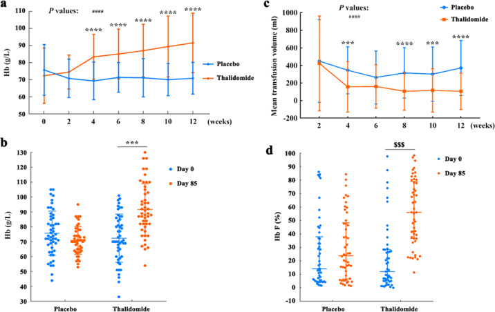 Thalidomide induces γ-globin expression in erythroid progenitor cells, but its efficacy on patients with transfusion-dependent β-thalassemia (TDT) remains unclear. In this phase 2, multi-center, randomized, double-blind clinical trial, we aimed to determine the safety and efficacy of thalidomide in TDT patients. A hundred patients of 14 years or older were randomly assigned to receive placebo or thalidomide for 12 weeks, followed by an extension phase of at least 36 weeks. The primary endpoint was the change of hemoglobin (Hb) level in the patients. The secondary endpoints included the red blood cell (RBC) units transfused and adverse effects. In the placebo-controlled period, Hb concentrations in patients treated with thalidomide achieved a median elevation of 14.0 (range, 2.5 to 37.5) g/L, whereas Hb in patients treated with placebo did not significantly change. Within the 12 weeks, the mean RBC transfusion volume for patients treated with thalidomide and placebo was 5.4 ± 5.0 U and 10.3 ± 6.4 U, respectively (P < 0.001). Adverse events of drowsiness, dizziness, fatigue, pyrexia, sore throat, and rash were more common with thalidomide than placebo. In the extension phase, treatment with thalidomide for 24 weeks resulted in a sustainable increase in Hb concentrations which reached 104.9 ± 19.0 g/L, without blood transfusion. Significant increase in Hb concentration and reduction in RBC transfusions were associated with non β0/β0 and HBS1L-MYB (rs9399137 C/T, C/C; rs4895441 A/G, G/G) genotypes. These results demonstrated that thalidomide is effective in patients with TDT.