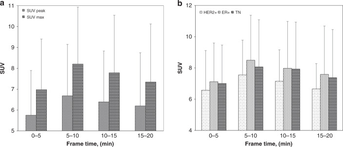 Results: A reversible one-tissue compartment model was shown to best describe tracer uptake in breast cancer. No significant differences were seen in kinetic or static parameters for different tumour receptor subtypes or grades. Kinetic and static parameters showed a good correlation.