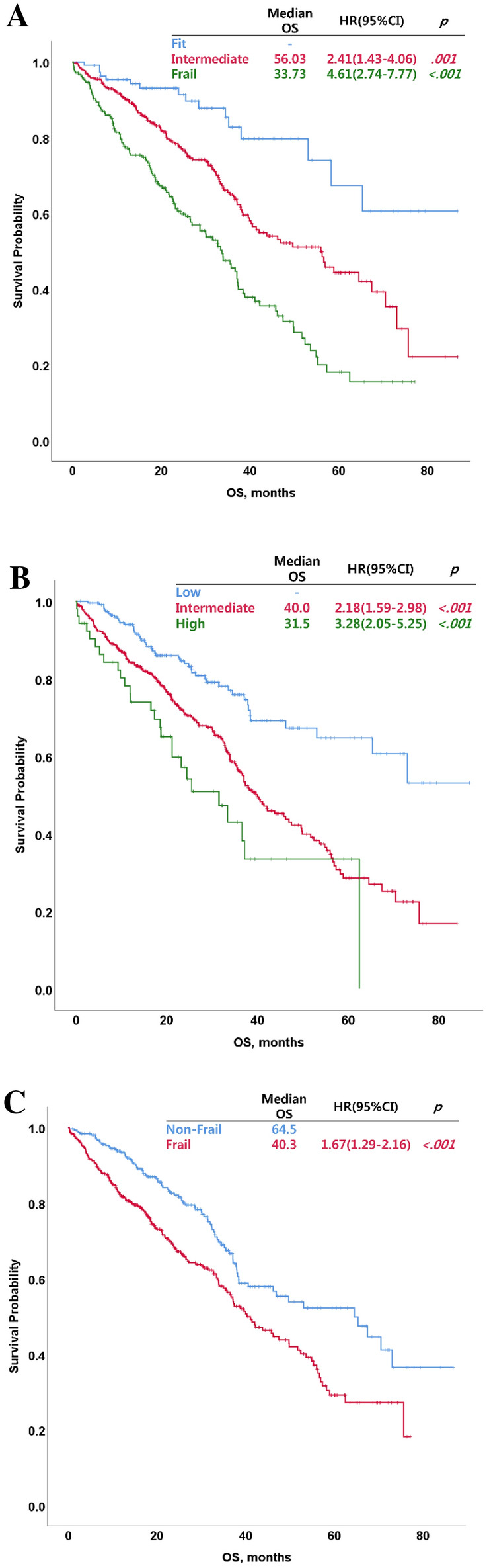 The number of elderly people is rapidly growing, and the proportion of elderly patients with multiple myeloma (MM) continues to increase. This study aimed to develop a frailty assessment tool based on clinical data and to estimate its feasibility in elderly patients with MM. This study analyzed data from 728 elderly transplant-ineligible patients with newly diagnosed MM who were treated between January 2010 and October 2019. Our clinical frailty index included age (< 75, and ≥ 75 years), Charlson comorbidity index (CCI; < 3 and ≥ 3), and Eastern Cooperative Oncology Group performance status score (ECOG score; 0, 1-2, and ≥ 3). Patients were classified as fit, intermediate, or frail if they had a score of 0, 1, or ≥ 2, respectively. The overall survival rates differed significantly according to frailty (fit vs. intermediate: hazard ratio [HR] = 2.41; 95% confidence interval [CI] = 1.43-4.06; P = 0.001; fit vs. frail: HR = 4.61; 95% CI = 2.74-7.77; P < 0.001 and intermediate vs. frail: HR = 1.91, 95% CI = 1.49-2.45, P < 0.001, respectively). The frail had significantly shorter EFS compared with the fit and intermediate group in our frailty index (fit vs. intermediate: HR = 1.34, 95% CI = 0.92-1.96, P = 0.132; fit vs. frail: HR = 2.06, 95% CI = 1.40-3.02, P < 0.001; and intermediate vs. frail: HR = 1.53, 95% CI = 1.22-1.92, P < 0.001, respectively). The new clinical frailty index, which is based on age, CCI, and ECOG PS, can easily assess frailty in elderly patients with MM and can be helpful in predicting survival outcomes in real world clinical setting.