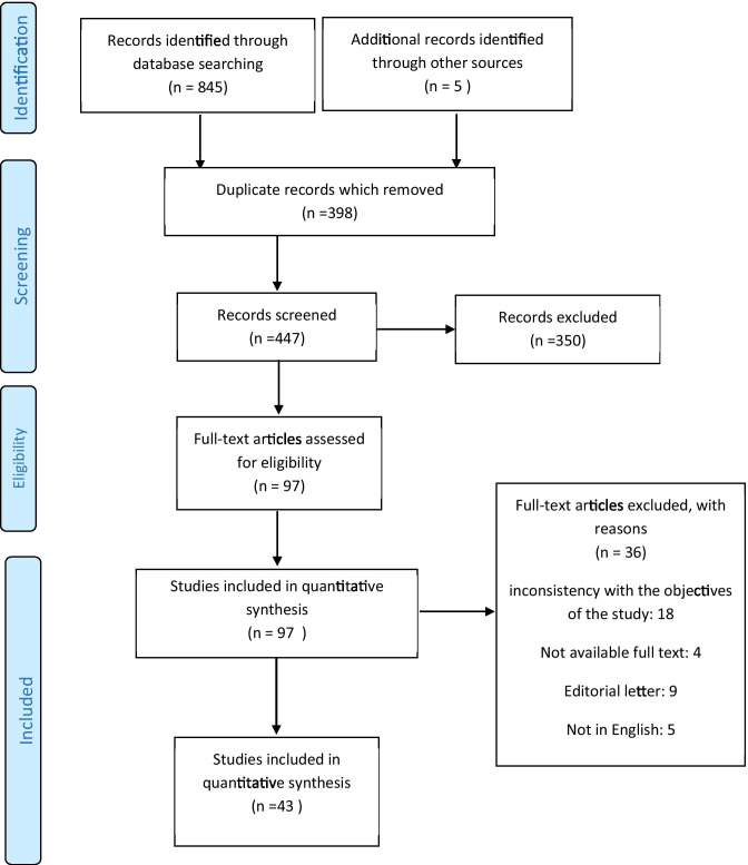 Results: Of the 850 studies, 43 were identified as eligible. According to studies, the diagnosis of colorectal cancer and the number of diagnostic procedures have decreased. Emergency visits due to obstruction or perforation of the large intestine or in advanced stages of cancer have increased, and a delay in the diagnosis of colorectal cancer has reported from 5.4 to 26%. Treatment of colorectal cancer has also decreased significantly or has been delayed, interrupted, or stopped. This reduction and delay have been observed in all treatments, including surgery, chemotherapy, and long-term radiation therapy; only cases of emergency surgery and short-term radiotherapy has increased. The waiting time for hospitalization and the length of hospital stay after surgery has been reported to be higher. Changes in patients' treatment plans and complete to partial cessation of hospitals activities-that provided treatment services-were reported.
