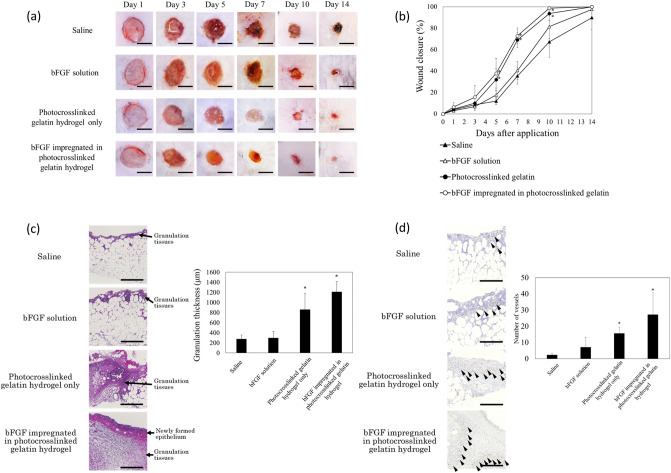 Biomaterials traditionally used for wound healing can act as a temporary barrier to halt bleeding, prevent infection, and enhance regeneration. Hydrogels are among the best candidates for wound healing owing to their moisture retention and drug-releasing properties. Photo-polymerization using visible light irradiation is a promising method for hydrogel preparation since it can easily control spatiotemporal reaction kinetics and rapidly induce a single-step reaction under mild conditions. In this study, photocrosslinked gelatin hydrogels were imparted with properties namely fast wound adherence, strong wet tissue surface adhesion, greater biocompatibility, long-term bFGF release, and importantly, ease of use through the modification and combination of natural bio-macromolecules. The production of a gelatin hydrogel made of natural gelatin (which is superior to chemically modified gelatin), crosslinked by visible light, which is more desirable than UV light irradiation, will enable its prolonged application to uneven wound surfaces. This is due to its flexible shape, along with the administration of cell growth factors, such as bFGF, for tissue regeneration. Further, the sustained release of bFGF enhances wound healing and skin flap survival. The photocrosslinking gelatin hydrogel designed in this study is a potential candidate to enhance wound healing and better skin flap survival.