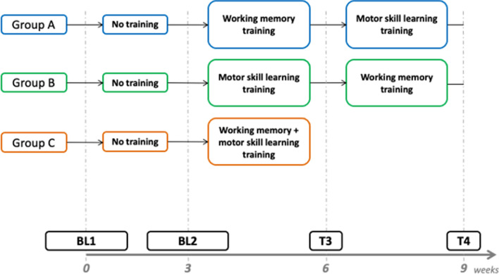 Although shared behavioral and neural mechanisms between working memory (WM) and motor sequence learning (MSL) have been suggested, the additive and interactive effects of training have not been studied. This study aimed at investigating changes in brain functional connectivity (FC) induced by sequential (WM + MSL and MSL + WM) and combined (WM × MSL) training programs. 54 healthy subjects (27 women; mean age: 30.2 ± 8.6 years) allocated to three training groups underwent twenty-four 40-min training sessions over 6 weeks and four cognitive assessments including functional MRI. A double-baseline approach was applied to account for practice effects. Test performances were compared using linear mixed-effects models and t-tests. Resting state fMRI data were analysed using FSL. Processing speed, verbal WM and manual dexterity increased following training in all groups. MSL + WM training led to additive effects in processing speed and verbal WM. Increased FC was found after training in a network including the right angular gyrus, left superior temporal sulcus, right superior parietal gyrus, bilateral middle temporal gyri and left precentral gyrus. No difference in FC was found between double baselines. Results indicate distinct patterns of resting state FC modulation related to sequential and combined WM and MSL training suggesting a relevance of the order of training performance. These observations could provide new insight for the planning of effective training/rehabilitation.