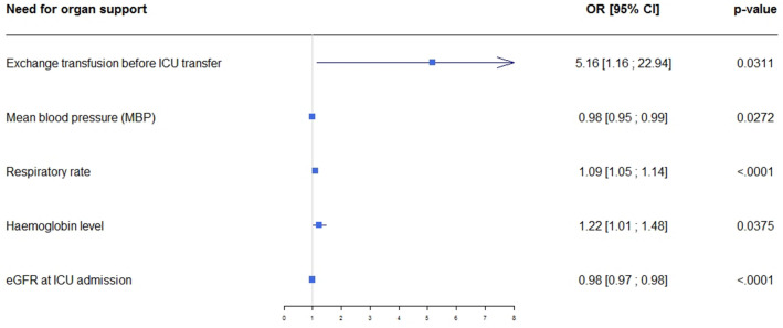 Little is known about patients with sickle cell disease (SCD) who require intensive care unit (ICU) admission. The goals of this study were to assess outcomes in patients admitted to the ICU for acute complications of SCD and to identify factors associated with adverse outcomes. This multicenter retrospective study included consecutive adults with SCD admitted to one of 17 participating ICUs. An adverse outcome was defined as death or a need for life-sustaining therapies (non-invasive or invasive ventilation, vasoactive drugs, renal replacement therapy, and/or extracorporeal membrane oxygenation). Factors associated with adverse outcomes were identified by mixed multivariable logistic regression. We included 488 patients admitted in 2015-2017. The main reasons for ICU admission were acute chest syndrome (47.5%) and severely painful vaso-occlusive event (21.3%). Sixteen (3.3%) patients died in the ICU, mainly of multi-organ failure following a painful vaso-occlusive event or sepsis. An adverse outcome occurred in 81 (16.6%; 95% confidence interval [95% CI], 13.3%-19.9%) patients. Independent factors associated with adverse outcomes were low mean arterial blood pressure (adjusted odds ratio [aOR], 0.98; 95% CI 0.95-0.99; p = 0.027), faster respiratory rate (aOR, 1.09; 95% CI 1.05-1.14; p < 0.0001), higher haemoglobin level (aOR, 1.22; 95% CI 1.01-1.48; p = 0.038), impaired creatinine clearance at ICU admission (aOR, 0.98; 95% CI 0.97-0.98; p < 0.0001), and red blood cell exchange before ICU admission (aOR, 5.16; 95% CI 1.16-22.94; p = 0.031). Patients with SCD have a substantial risk of adverse outcomes if they require ICU admission. Early ICU admission should be encouraged in patients who develop abnormal physiological parameters.