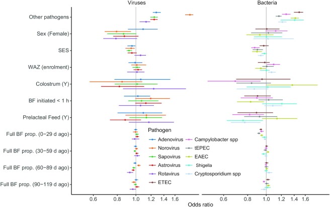 Methods: A total of 2145 newborns were enrolled at 8 sites, of whom 1712 had breastfeeding and key enteropathogen data through 6 mo. We focused on 11 enteropathogens: adenovirus 40/41, norovirus, sapovirus, astrovirus, and rotavirus, enterotoxigenic Escherichia coli (ETEC), Campylobacter spp., and typical enteropathogenic E. coli as well as entero-aggregative E. coli, Shigella and Cryptosporidium. Logistic regression was used to estimate the risk of enteropathogen detection in stools and survival analysis was used to estimate the timing of first detection of an enteropathogen.
