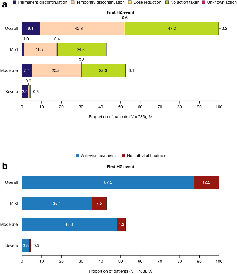 Methods: This post hoc analysis included data from 21 RA and 3 PsA clinical studies; data were pooled for tofacitinib doses. Outcomes of HZ events (serious and non-serious) and tofacitinib treatment changes were evaluated in response to first and second HZ events. Median time to resolution was stratified by dermatomal involvement, history of HZ prior to tofacitinib, changes to tofacitinib treatment, anti-viral and corticosteroid use, and tofacitinib dose.