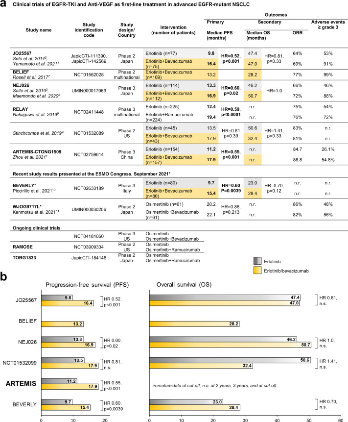 Bevacizumab plus erlotinib in Chinese patients with untreated, EGFR-mutated, advanced NSCLC (ARTEMIS-CTONG1509): A multicenter phase 3 study.Cancer Cell. 2021 Sep 13;39(9):1279-1291.e3. doi: 10.1016/j.ccell.2021.07.005. Epub 2021 Aug 12. Cancer Cell. 2021. PMID: 34388377 Clinical Trial.