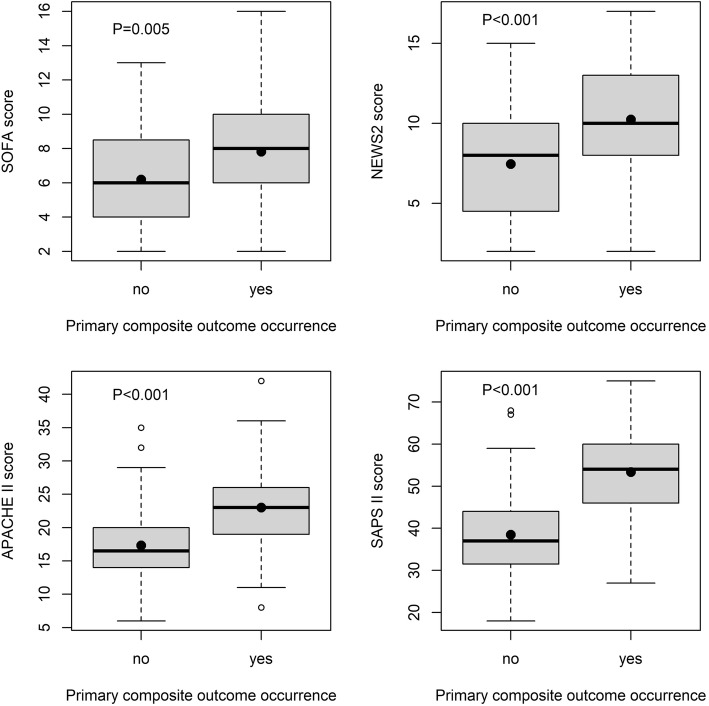 Results: Patients older than 64 years (elderly) represent 82% of sample. Primary and secondary outcomes occurred in 40 and 44%, respectively. Median 30-day survival time of dead patients was 4 days (interquartile range 1-11). The best predictive score based on the area under the receiver operating curve (AUROC) was SAPS II (0.823, 95% confidence interval, CI, 0.744-0.902), followed by APACHE II (0.762, 95% CI 0.673-0.850), NEWS2 (0.708, 95% CI 0.616-0.800), and SOFA (0.650, 95% CI 0.548-0.751). SAPS II cut-off of 49 showed the lowest false-positive rate (12, 95% CI 5-20) and the highest positive predictive value (80, 95% CI 68-92), whereas NEWS2 cut-off of 7 showed the lowest false-negative rate (10, 95% CI 2-19) and the highest negative predictive value (86, 95% CI 74-97). By combining NEWS2 and SAPS II cut-offs, we accurately classified 64% of patients. In survival analysis, SAPS II cut-off showed the highest difference in 30-day mortality (Hazards Ratio, HR, 5.24, 95% CI 2.99-9.21, P < 0.001). Best independent negative predictors of 30-day mortality were body temperature, mean arterial pressure, arterial oxygen saturation, and hematocrit levels. Positive predictors were male sex, heart rate and serum sodium concentration.