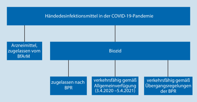 Durch die COVID-19-Pandemie haben Desinfektionsmaßnahmen auch in Deutschland an Bedeutung gewonnen. Der erhöhte Bedarf an Desinfektionsmitteln zu Beginn der Pandemie erforderte es, vorübergehende rechtliche Regelungen zu treffen, um einerseits ausreichend Mittel für die notwendige Desinfektion im medizinischen Bereich und andererseits für den zusätzlichen Bedarf in der Bevölkerung zur Verfügung zu haben. Dazu wurden vom Bundesinstitut für Arzneimittel und Medizinprodukte (BfArM) und der Bundesanstalt für Arbeitsschutz und Arbeitsmedizin (BAuA) Allgemeinverfügungen erlassen, die in diesem Beitrag näher erläutert werden. Im Vordergrund stehen dabei die Maßnahmen für die hygienische Händedesinfektion. Aber auch weitere Anwendungen wie die Flächendesinfektion im Zusammenhang mit pandemischen Atemwegserkrankungen werden erörtert. Die Erfahrungen bei der Sicherstellung der Versorgung mit wirksamen und in der Anwendung sicheren Desinfektionsmitteln sollten für die Vorbereitung weiterer Pandemien genutzt werden.