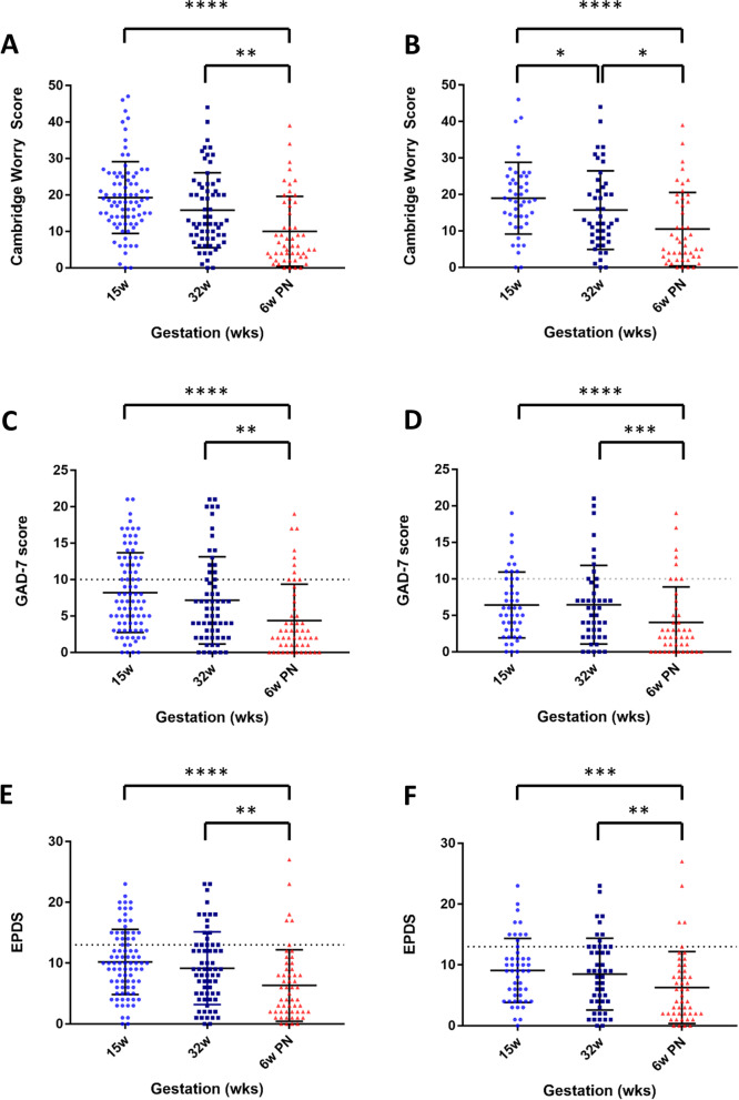 Results: In total 112 women participated in the study. Measures of anxiety and depressive symptoms decreased from the highest levels at 15 weeks' gestation to 6-weeks postnatal (for example mean GAD-7: 15 weeks 8.2 ± 5.5, 6 weeks postnatal 4.4 ± 5.0, p<0.001). Hair cortisol levels fell in a similar profile to anxiety and depression symptoms (p<0.05). In contrast, the median EQ-5D index, measuring health status was 0.768 at 15 weeks' gestation (Interquartile range (IQR) 0.684-0.879), 0.696 at 32 weeks' (IQR 0.637-0.768) and 0.89 (0.760-1.00) at 6 weeks postnatal. There was a negative relationship between EPDS and perceived health status.