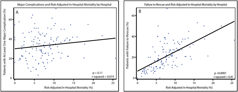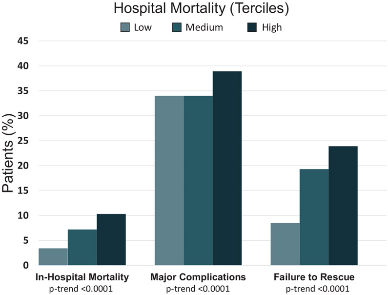Results: The overall unadjusted in-hospital mortality rate was 6.96%. Risk-adjusted in-hospital mortality rates varied 3.1-fold across terciles (low, 3.3%; high, 10.3%; P trend <.001). Rates of major complications varied 1.1-fold (low, 34.0%; high, 38.8%; P < .0001). Among patients with a major complication, 854 died in-hospital for an FTR rate of 17.7%, with 2.8-fold variation across mortality terciles (low, 8.5%; high, 23.9%; P < .0001). FTR rates were highest for renal dysfunction requiring dialysis (45.3%) and stroke (36.5%). Higher average annual LVAD volume was associated with higher rates of major complications (<10 per year, 26.7%; 10-20 per year, 34.0%; 20-30 per year, 34.0%; >30 per year, 40.1%; P trend <.0001) whereas hospitals implanting <10 per year had the highest FTR rate (<10 per year, 23.5%; 10-20 per year, 16.5%; 20-30 per year, 17.0%; >30 per year, 17.9%; P = .03).