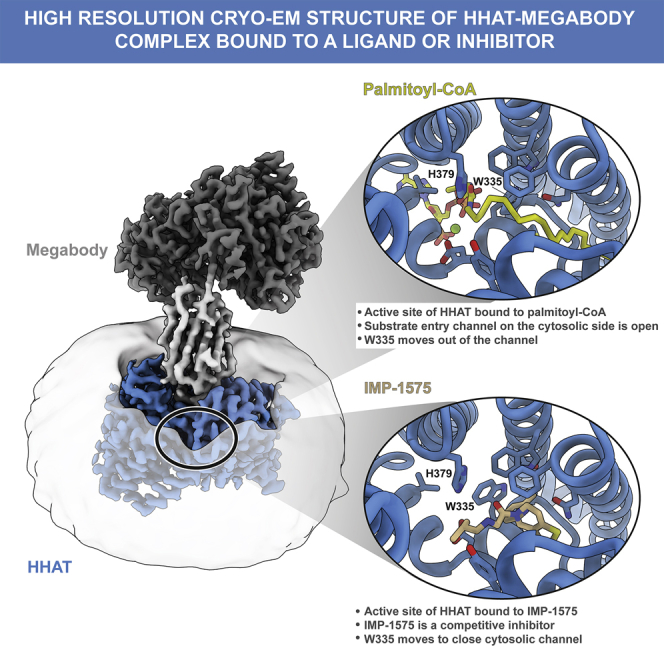 The Sonic Hedgehog (SHH) morphogen pathway is fundamental for embryonic development and stem cell maintenance and is implicated in various cancers. A key step in signaling is transfer of a palmitate group to the SHH N terminus, catalyzed by the multi-pass transmembrane enzyme Hedgehog acyltransferase (HHAT). We present the high-resolution cryo-EM structure of HHAT bound to substrate analog palmityl-coenzyme A and a SHH-mimetic megabody, revealing a heme group bound to HHAT that is essential for HHAT function. A structure of HHAT bound to potent small-molecule inhibitor IMP-1575 revealed conformational changes in the active site that occlude substrate binding. Our multidisciplinary analysis provides a detailed view of the mechanism by which HHAT adapts the membrane environment to transfer an acyl chain across the endoplasmic reticulum membrane. This structure of a membrane-bound O-acyltransferase (MBOAT) superfamily member provides a blueprint for other protein-substrate MBOATs and a template for future drug discovery.