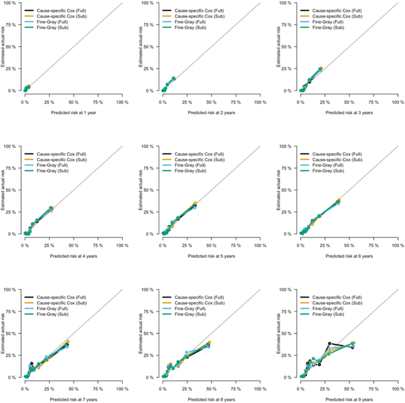 Results: 1136 patients were included in the study. The median follow-up time was 6.2 years. 125 (11%) women died from breast cancer and 155 (14%) died from other causes. For the prediction of BCD, the cause-specific Cox sub-model performed the best. The time dependent AUC begins above 0.91 in year one to 3 reducing to 0.83 in year 6. The factors included in the Cox sub model were tumour size, skin thickening, source of detection, tumour grade, ER status, pre-operative nodal metastasis and CKD.