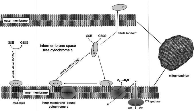 Cytochrome c is a member of the respiratory chain of the mitochondria. Non-membrane-bound (free) cytochrome c can be reduced by gluthatione as well as ascorbic acid. We investigated the effect of pH, Ca2+, Mg2+ and anionic phospholipids on the reduction of cytochrome c by glutathione.The reduction of cytochrome c by thiols was measured using photometry. Mitochondrial oxygen consumption was detected by use of oxygen electrode. Glutathione does not reduce cytochrome c at pH = 7.0 in the absence of Ca2+ and Mg2+. The reduction of cytochrome c by glutathione is inhibited by anionic lipids, especially cardiolipin. The typical conditions of apoptosis-elevated pH, Ca2+ level and Mg2+-increases the reduction of cytochrome c. Glutathione (5 mM) causes increased mitochondrial O2 consumption at pH = 8.0, in the presence of ADP either 1 mM Mg2+ or 1 mM Ca2+. Our results suggest that membrane bound cyt c does not oxidize glutathione. Free (not membrane bound) cytochrome c can oxidize glutathione. In mitochondria, O2 is depleted only in the presence of ADP, so the O2 depletion observed in the presence of glutathione can be related to the respiratory chain. Decreased glutathione levels play a role in apoptosis. Therefore, membrane unbound cyt c can contribute to apoptosis by oxidation of glutathione.