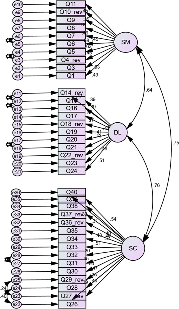 Results: The values of the comparative fit index (CFI), standardised root-mean-square residual (SRMR), and root mean square error of approximation (RMSEA) were ≥ 0.9, ≤ 0.08, and ≤ 0.08, respectively, for a model fit to be acceptable. EFA showed that except for Q2 (loading score: 0.210), Q12 (loading score: 0.384), Q13 (loading score: 0.362), and Q25 (loading score: -0.219), all the items loaded well. After the exclusion of the aforementioned items, the factor loading scores for the items in the self-management, desire for learning, and self-control factors ranged from 0.405 to 0.753 (Cronbach α: 0.775), 0.396 to 0.616 (Cronbach α: 0.730), and 0.427 to 0.556 (Cronbach α: 0.799), respectively. The updated model was used for CFA, which displayed a good model fit.