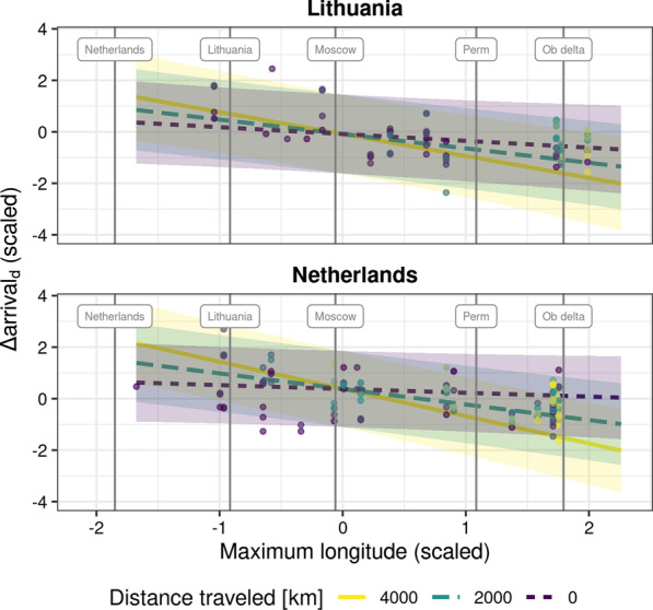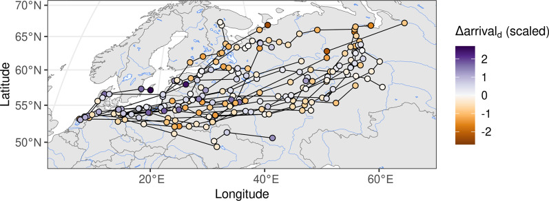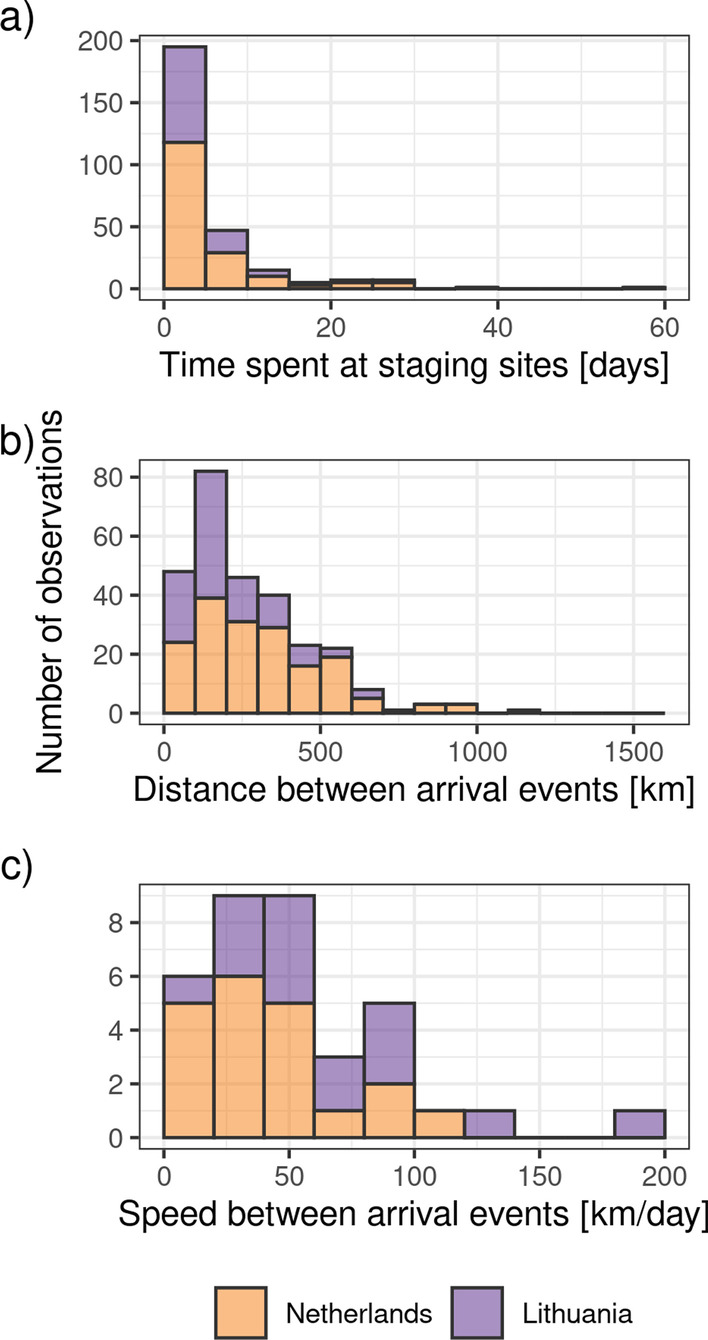 Methods: We captured wigeons in the Netherlands and Lithuania and tracked them throughout spring migration to identify staging sites and timing of arrival. Using temperature-derived indicators of spring phenology, we investigated how maximum longitude reached and migration distance affected how closely wigeons followed spring. We further estimated the impact of tagging on wigeon migration by comparing spring migratory timing between tracked individuals and ring recovery data sets.