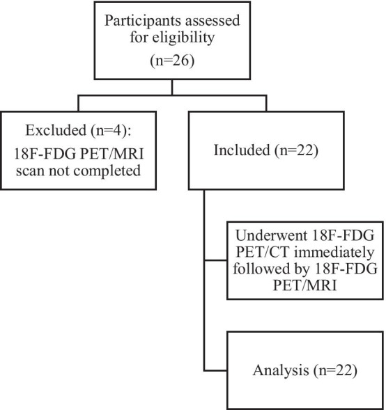 Conclusion: In this preliminary study, compared to 18F-FDG PET/CT, 18F-FDG PET/MRI showed non-significant higher concordance with T-staging, but no difference with N or M-staging. Additional metastases detected by 18F-FDG PET/MRI may be of additive clinical value.