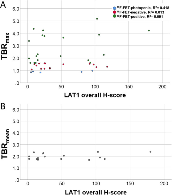 Results: IHC staining of LAT1 expression was positive in both, 18F-FET-positive as well as 18F-FET-negative gliomas. No differences were found between the 18F-FET-negative and 18F-FET-positive group with regard to percentage of LAT1-positive tumour cells, staining intensity or H-score. Interestingly, the LAT1 expression showed a significant negative correlation with the PFS (p = 0.031), whereas no significant correlation was found for TBRmax, neither in the overall group nor in the 18F-FET-positive group only (p = 0.651 and p = 0.140).