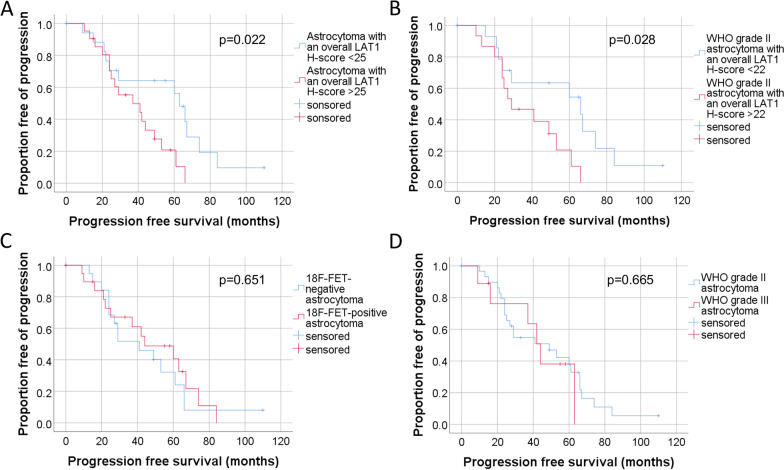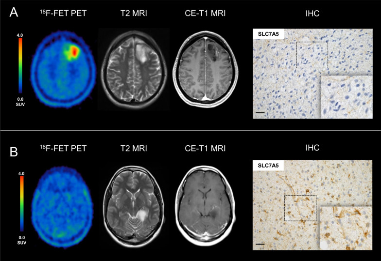 Conclusion: Although LAT1 is reported to mediate the uptake of 18F-FET into tumour cells, the levels of LAT1 expression do not correlate with the levels of 18F-FET uptake in IDH-mutant astrocytomas. In particular, the lack of tracer uptake in 18F-FET-negative gliomas cannot be explained by a reduced LAT1 expression. A higher LAT1 expression in IDH-mutant astrocytomas seems to be associated with a short PFS. Further studies regarding mechanisms influencing the uptake of 18F-FET are necessary.